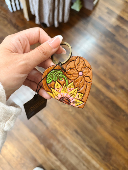 Sunflower Hand Tooled Carved Genuine Leather Keyring