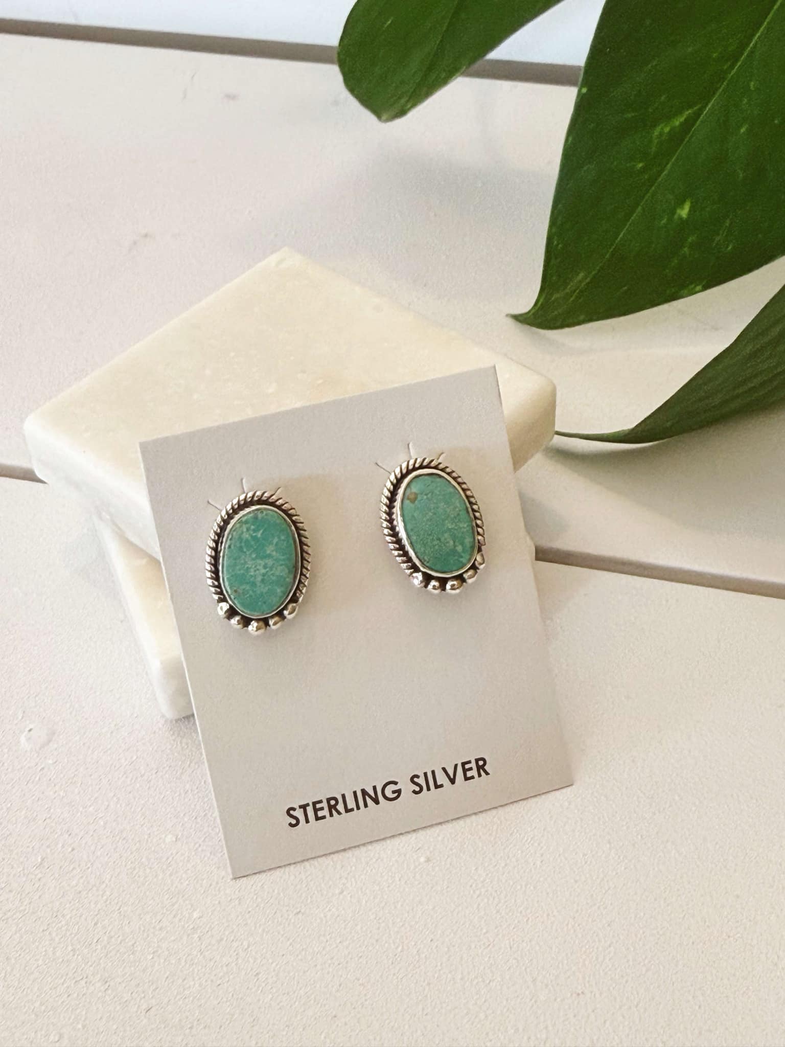 Timeless and captivating, the Desert Sky Earrings feature authentic Kingman turquoise stones framed with intricate sterling silver detailing. Their oval shape and artisan craftsmanship make them a versatile piece you’ll treasure for years.