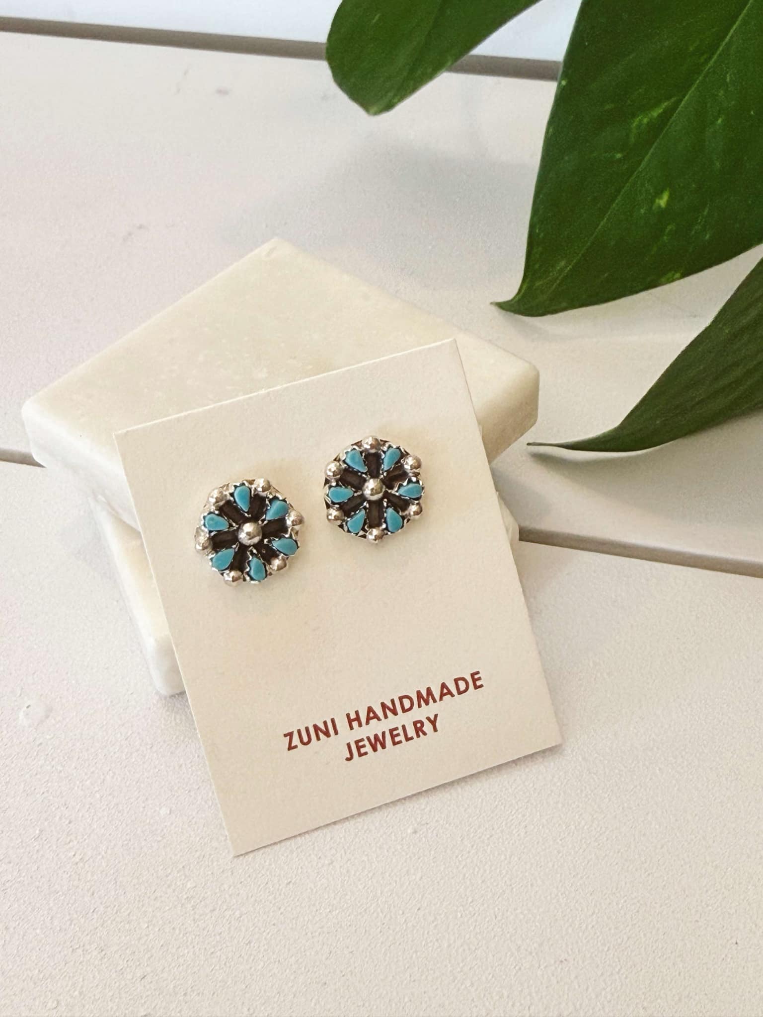 Artfully crafted by Zuni artisans, the Midnight Sun Earrings feature a striking round design with bold turquoise, black, and sterling silver accents. These authentic earrings bring timeless Southwestern beauty to any look.