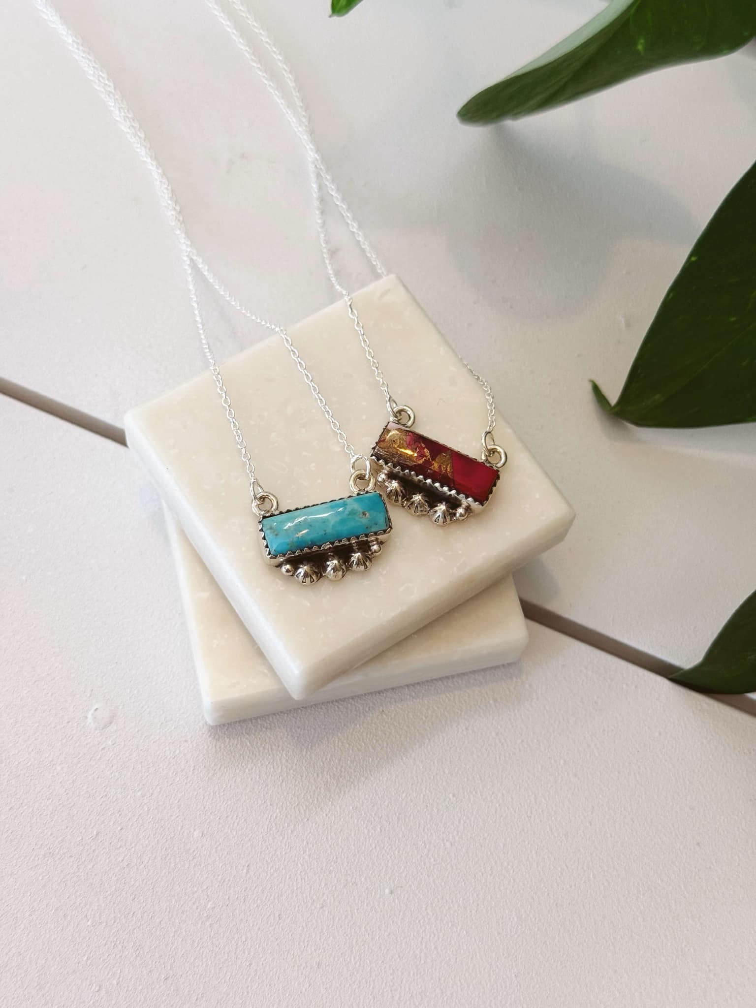 Bold and elegant, the Desert Bloom Necklace features a striking rectangular stone framed with detailed sterling silver accents. Available in vibrant turquoise or the rich Dahlia Rose stone, this authentic piece adds a pop of color and artisanal charm to any outfit.