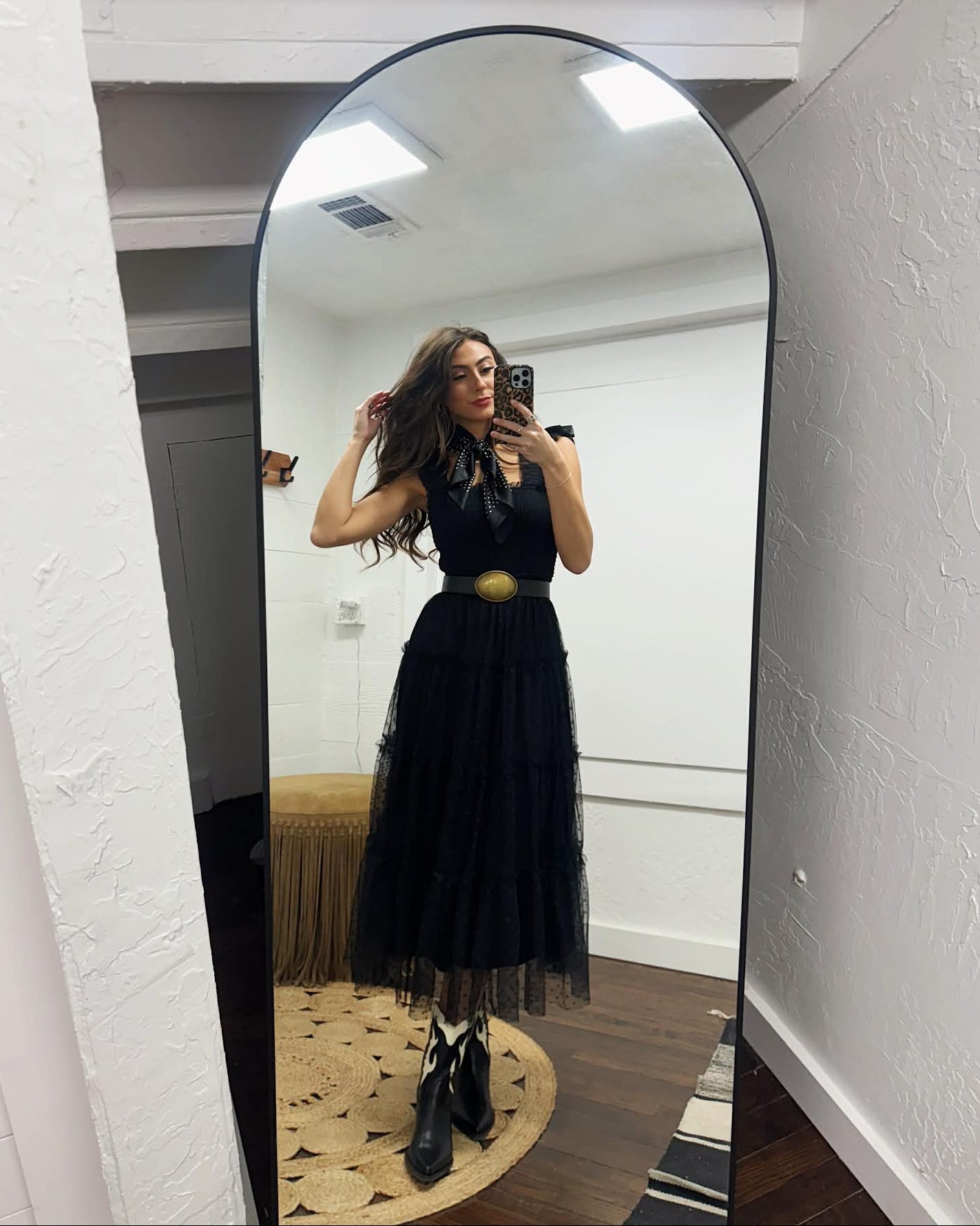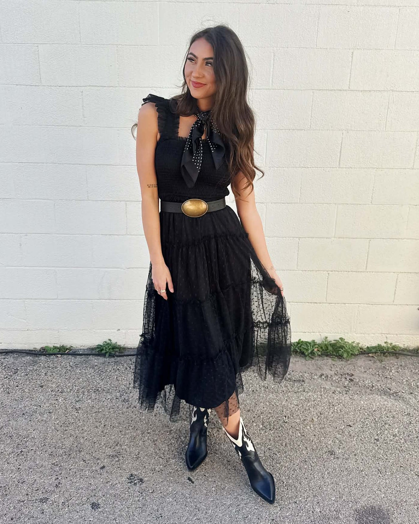 Playful and feminine, this tiered midi dress features a smocked bodice and ruffle trim for a flattering, flirty look. The perfect little black dress that’s classy but girly! The polka dot chiffon pattern adds a timeless touch that’s perfect for any occasion.
