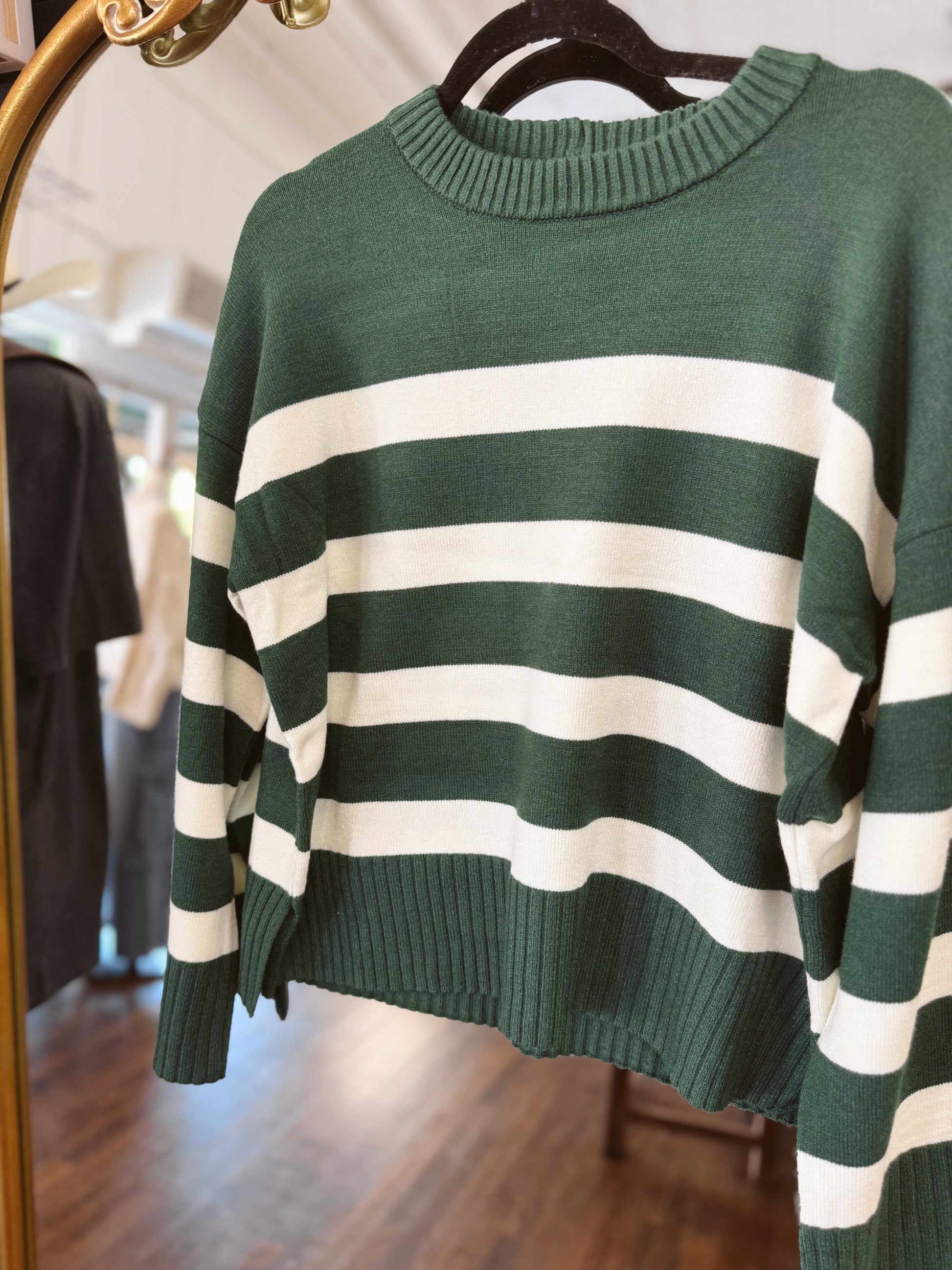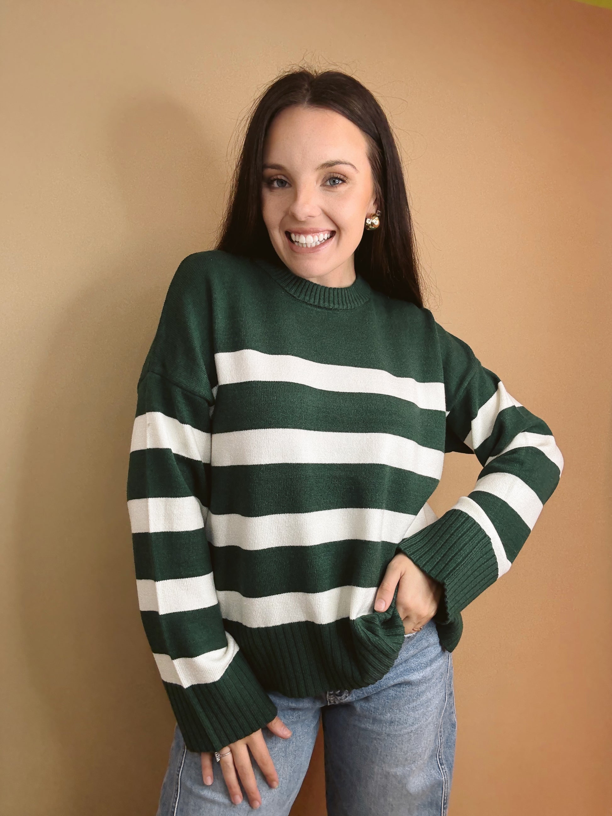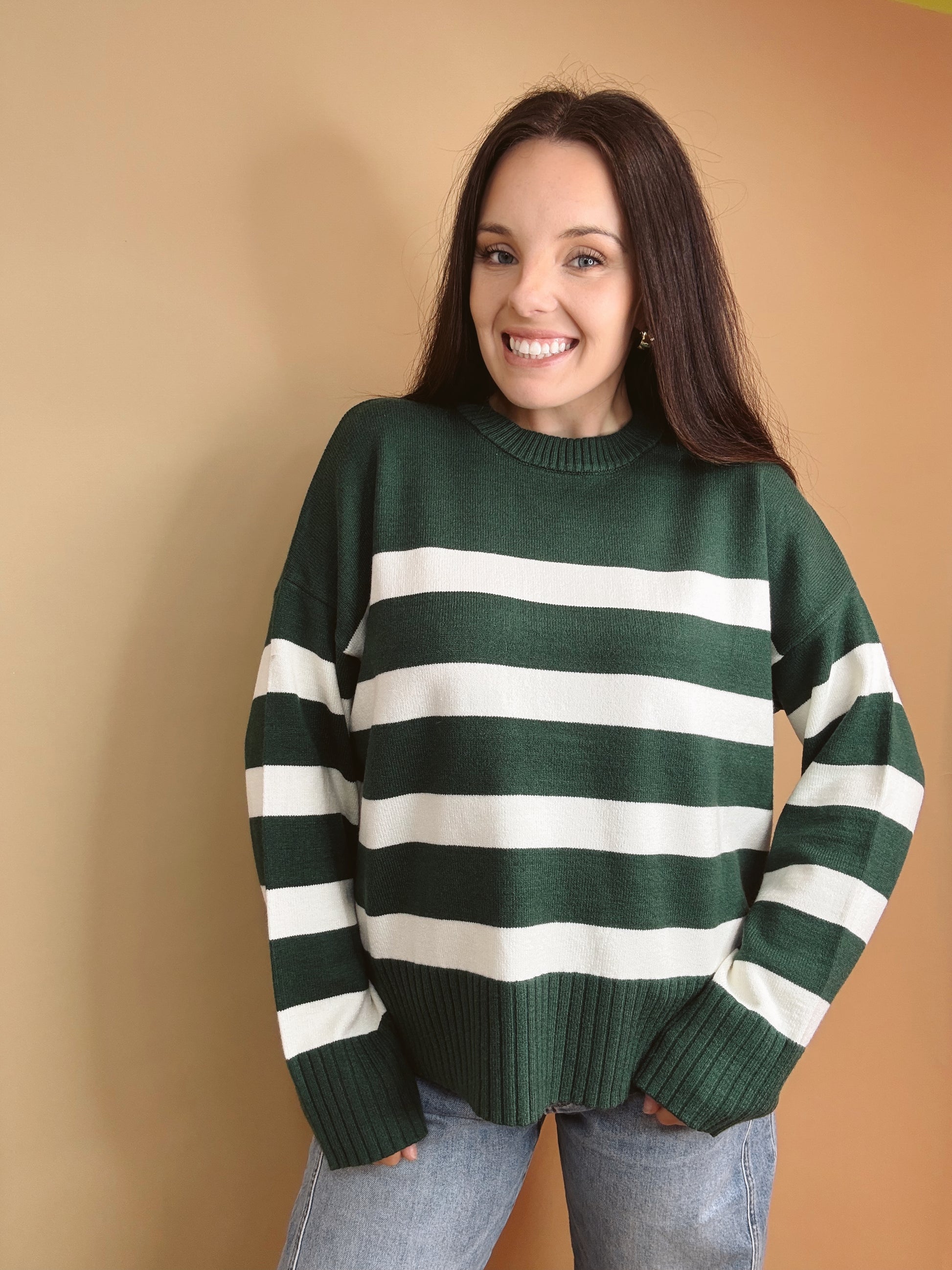 Designed for both comfort and style, this dark emerald green sweater shows off a striking striped pattern with a relaxed silhouette. Its crew neck and versatile design make it the perfect go-to for layering or casual wear.