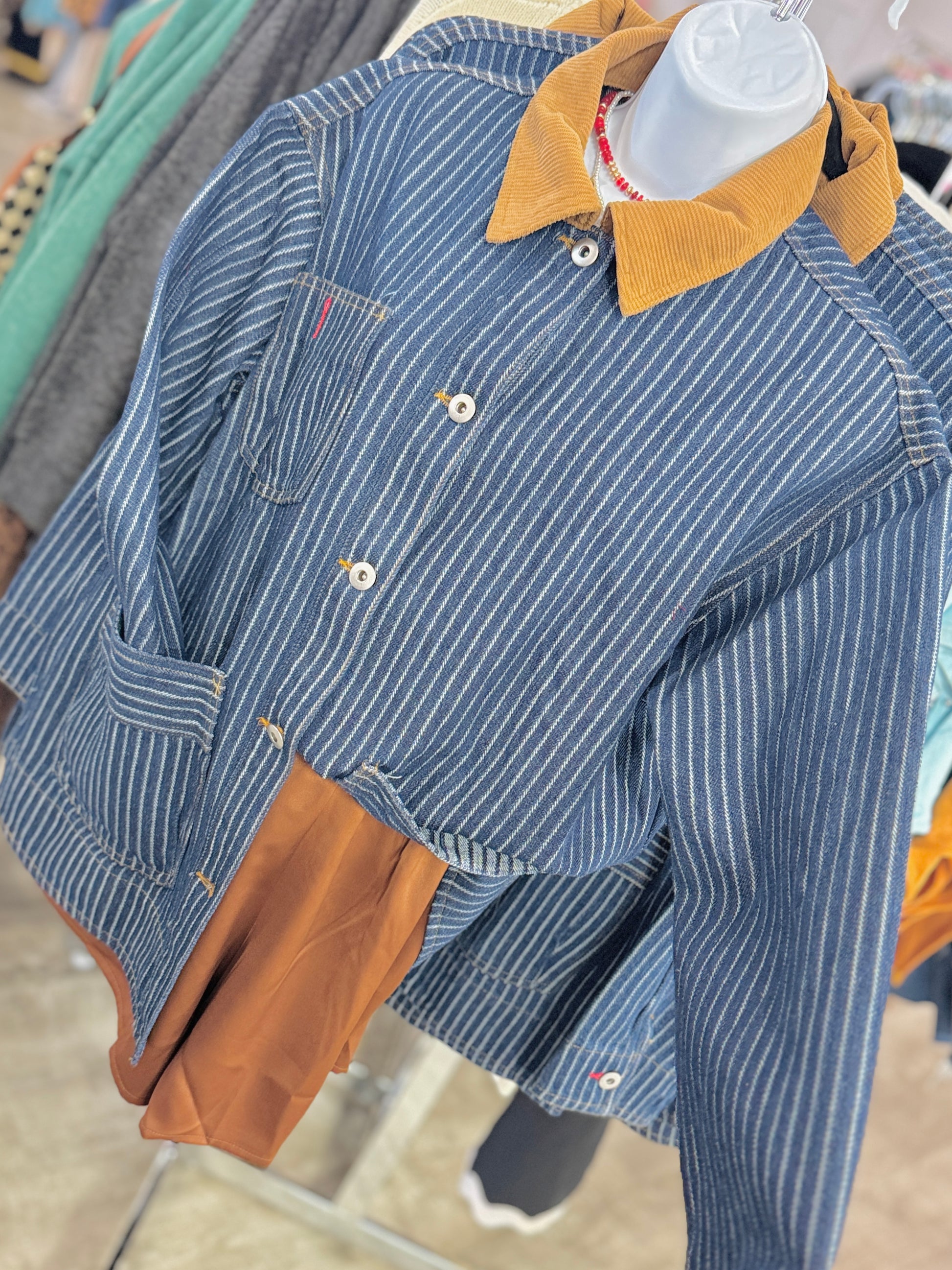 This stripe corduroy collar denim shacket brings playful flair to classic Western-inspired outerwear. With its relaxed fit and standout collar detail, it’s the perfect layering piece for boutique-ready, sassy style.