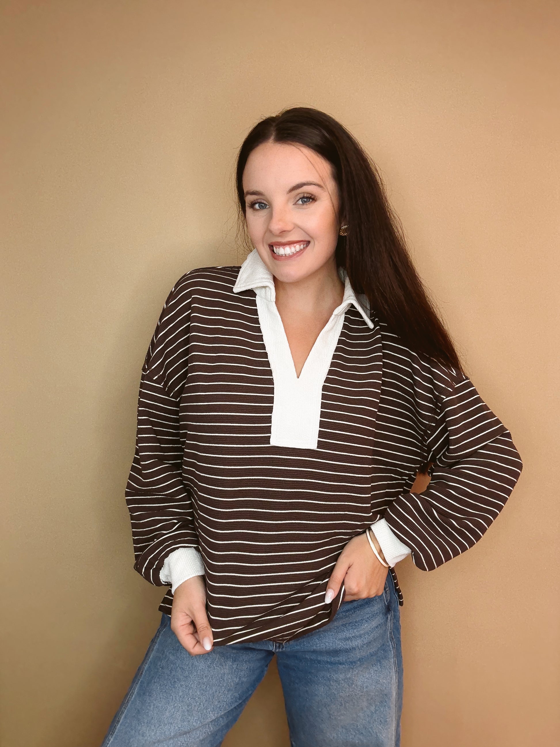 The Ellis Striped Pullover is a chic, lightweight layering piece that effortlessly blends classic stripes with a polished built-in collar. Its brown and white colorway adds a modern twist to a timeless design, perfect for casual or office-ready outfits.