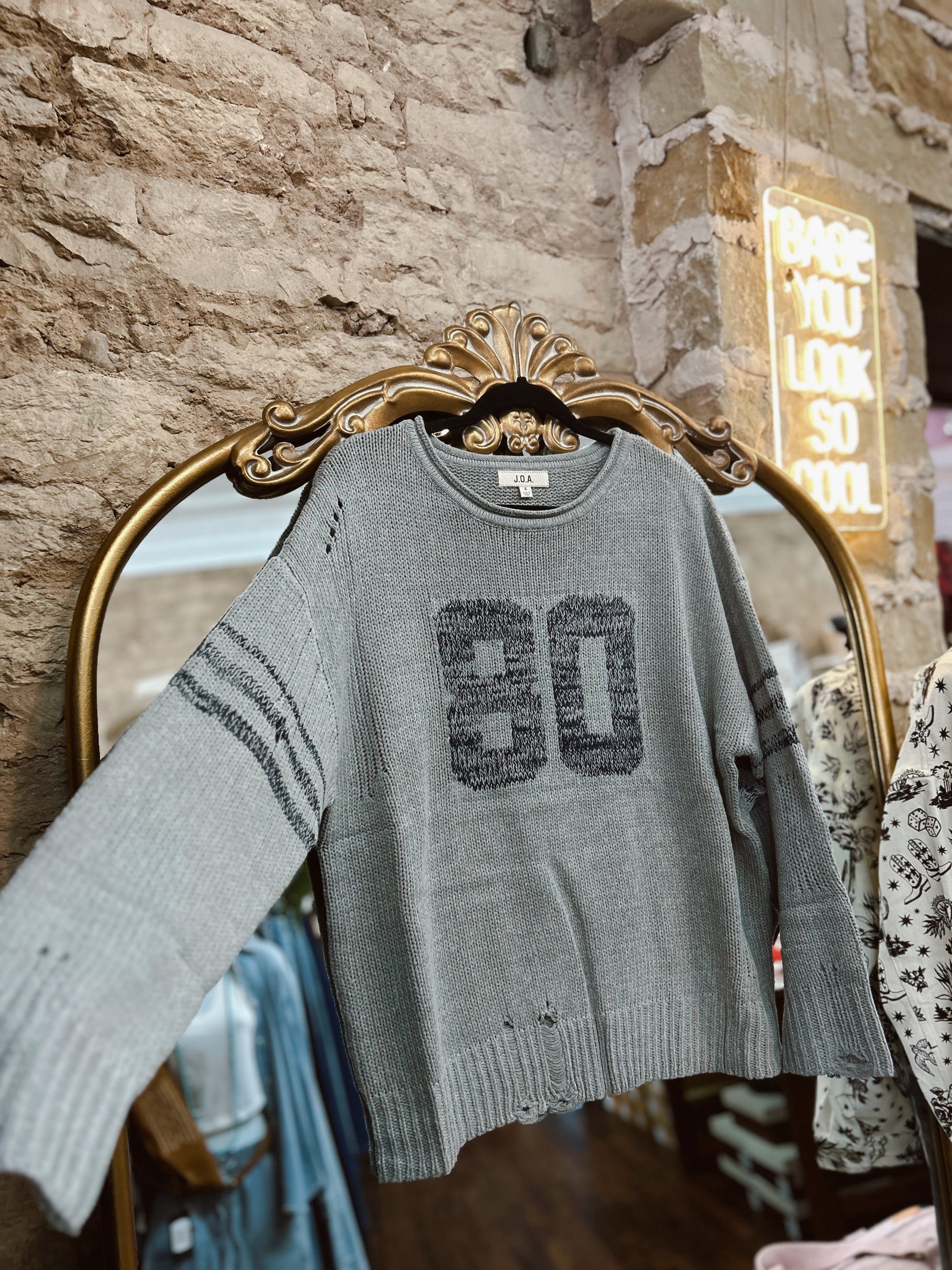This distressed varsity knit top brings sporty attitude with a sassy, relaxed vibe. With its stripe sleeve detail and bold number pattern, it’s perfect for making a playful statement while staying cozy.