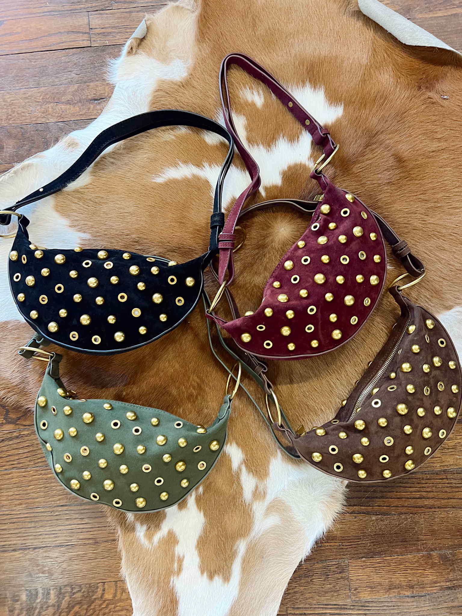 The Mauve Gold Studded Bag adds the perfect mix of edge and elegance to any outfit. Crafted from soft microsuede and finished with brass stud detailing, it’s your new go-to accessory for everyday style.