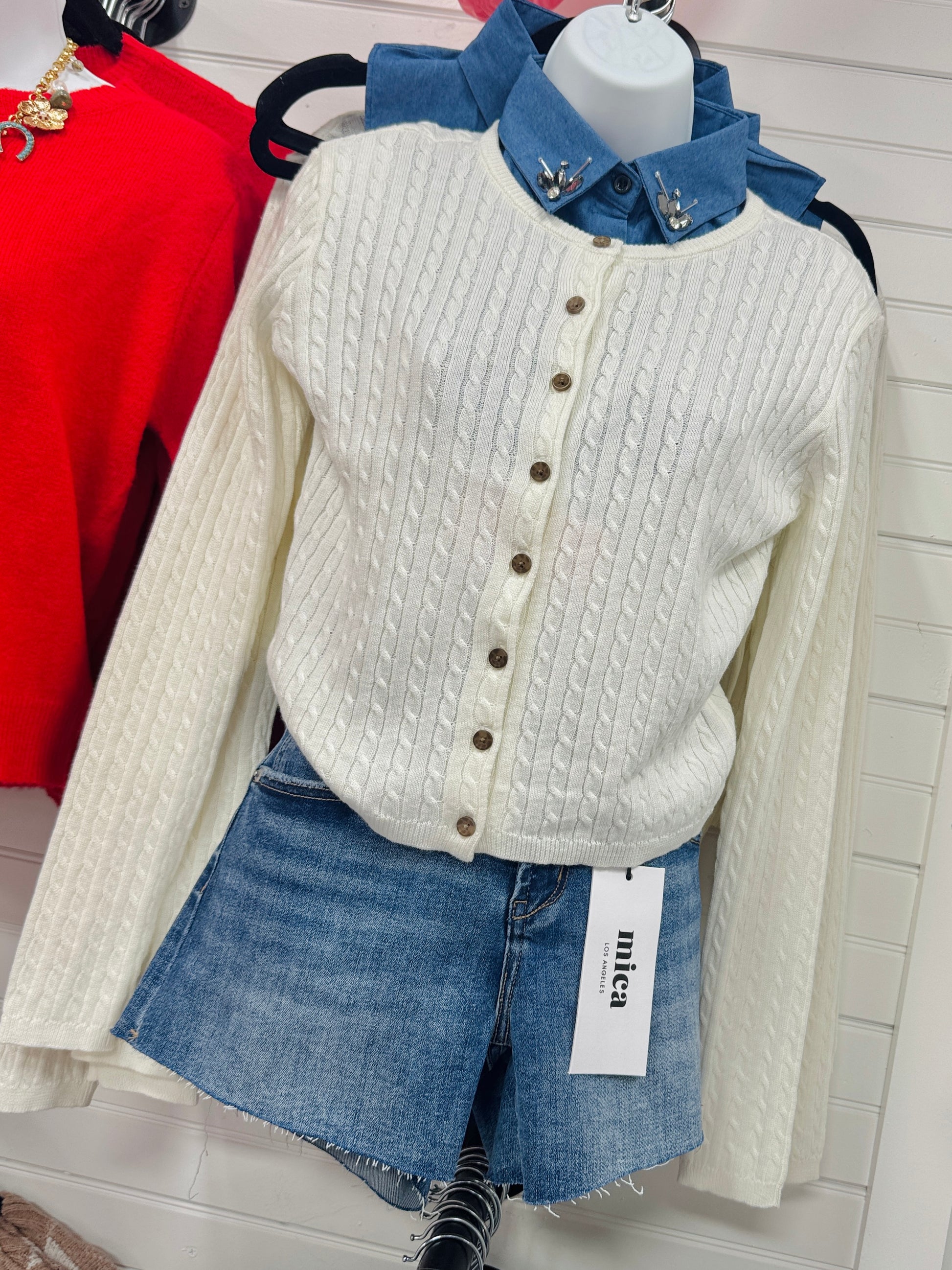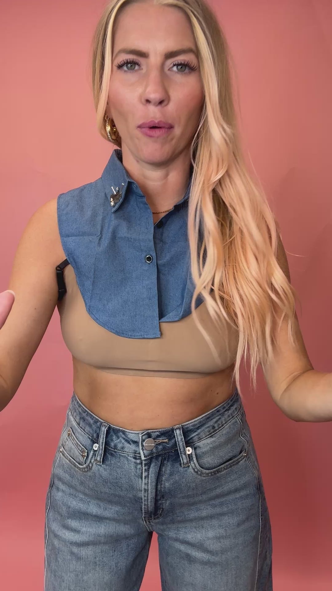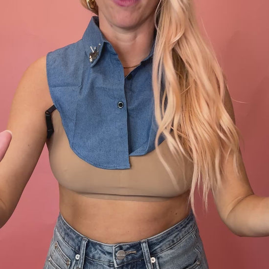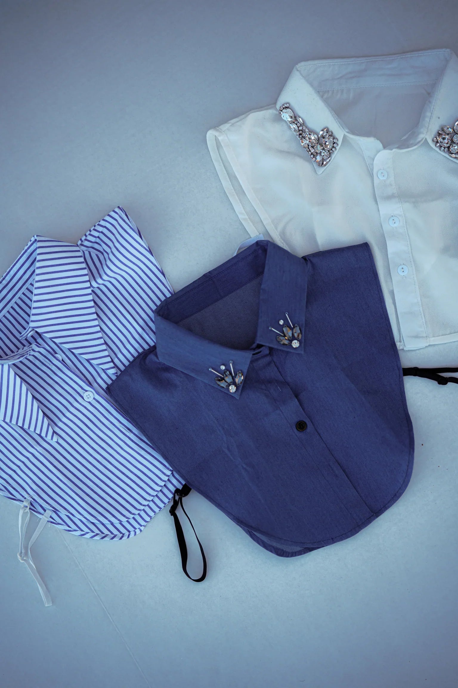 Diamond rhinestone trim white collar button down dickie. Want to look like you’re wearing a layering white collar blouse under your shirt? This mock neck collar will do just that! Adjustable under the arm straps to stay in place.