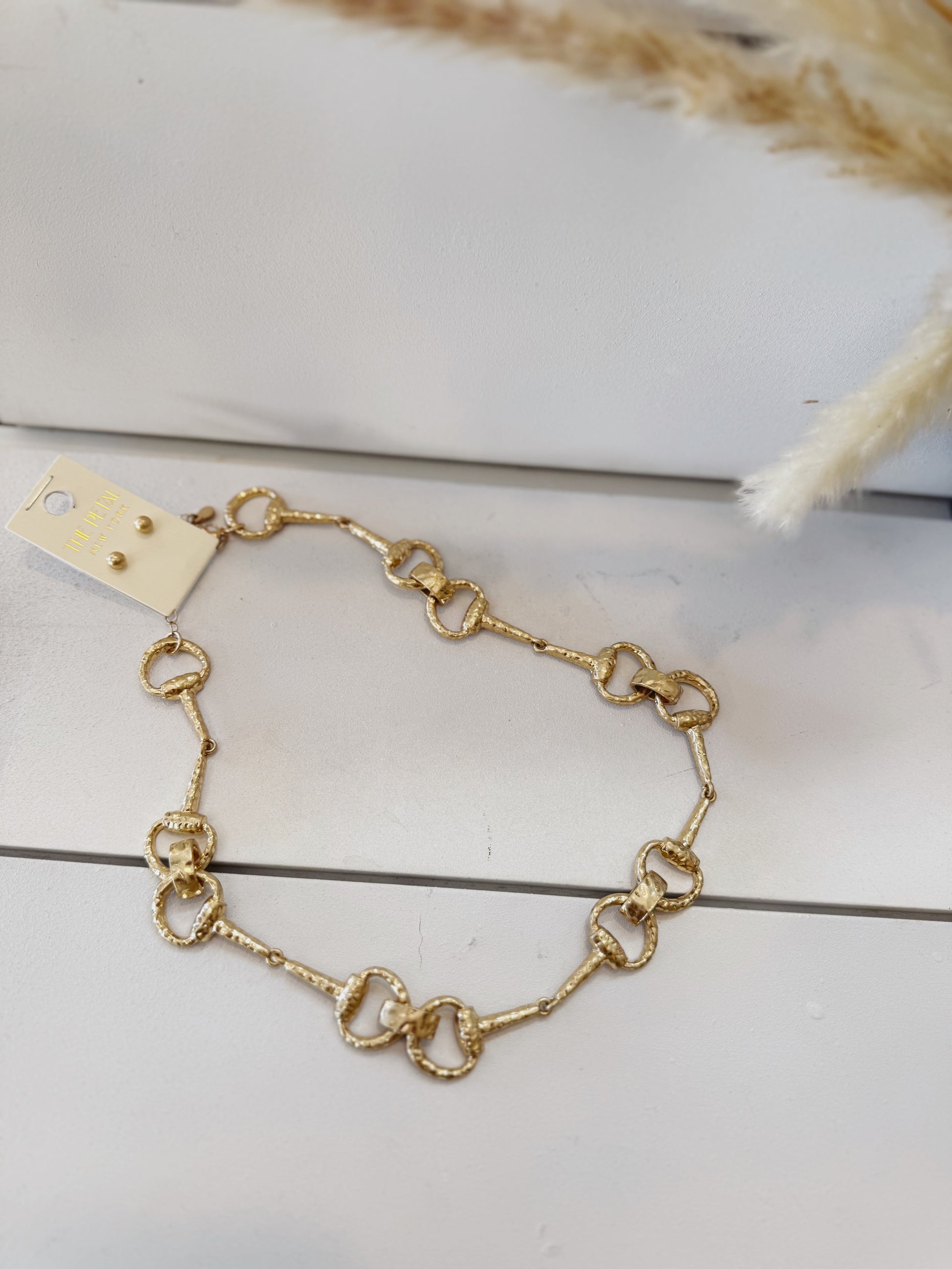 The Golden Link Horsebit Necklace brings a touch of equestrian elegance with its polished gold horsebit links. Bold yet timeless, it’s the perfect statement piece to layer or wear on its own.