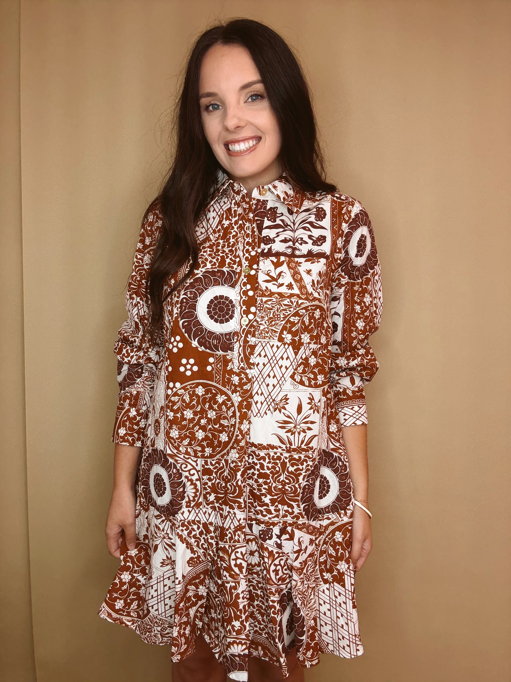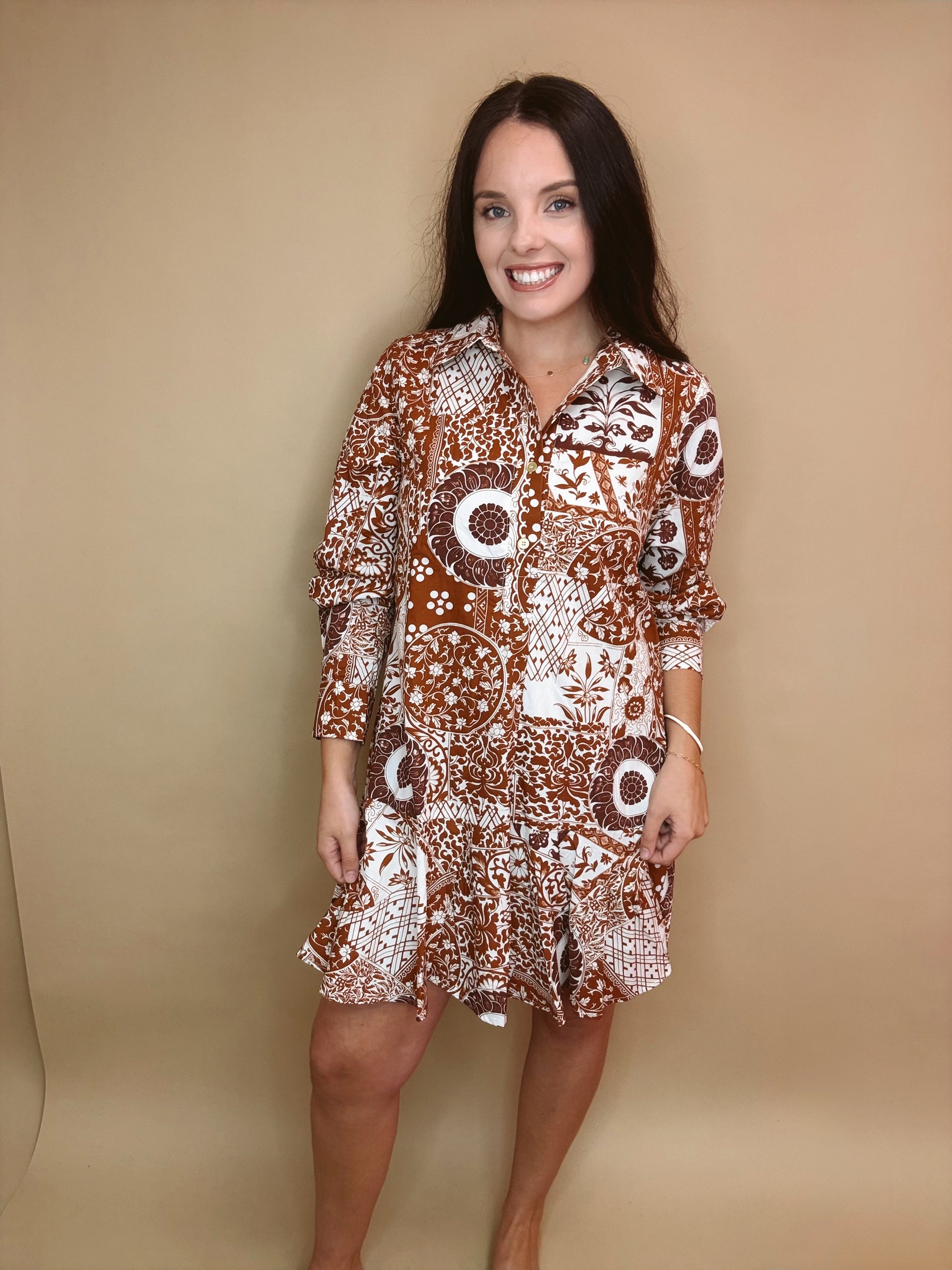 Fresh and feminine, this botanical print mini dress features long sleeves and a tiered ruffle hem for a playful silhouette. Lightweight and lined, it’s an easy choice for both casual days and dressed-up outings.