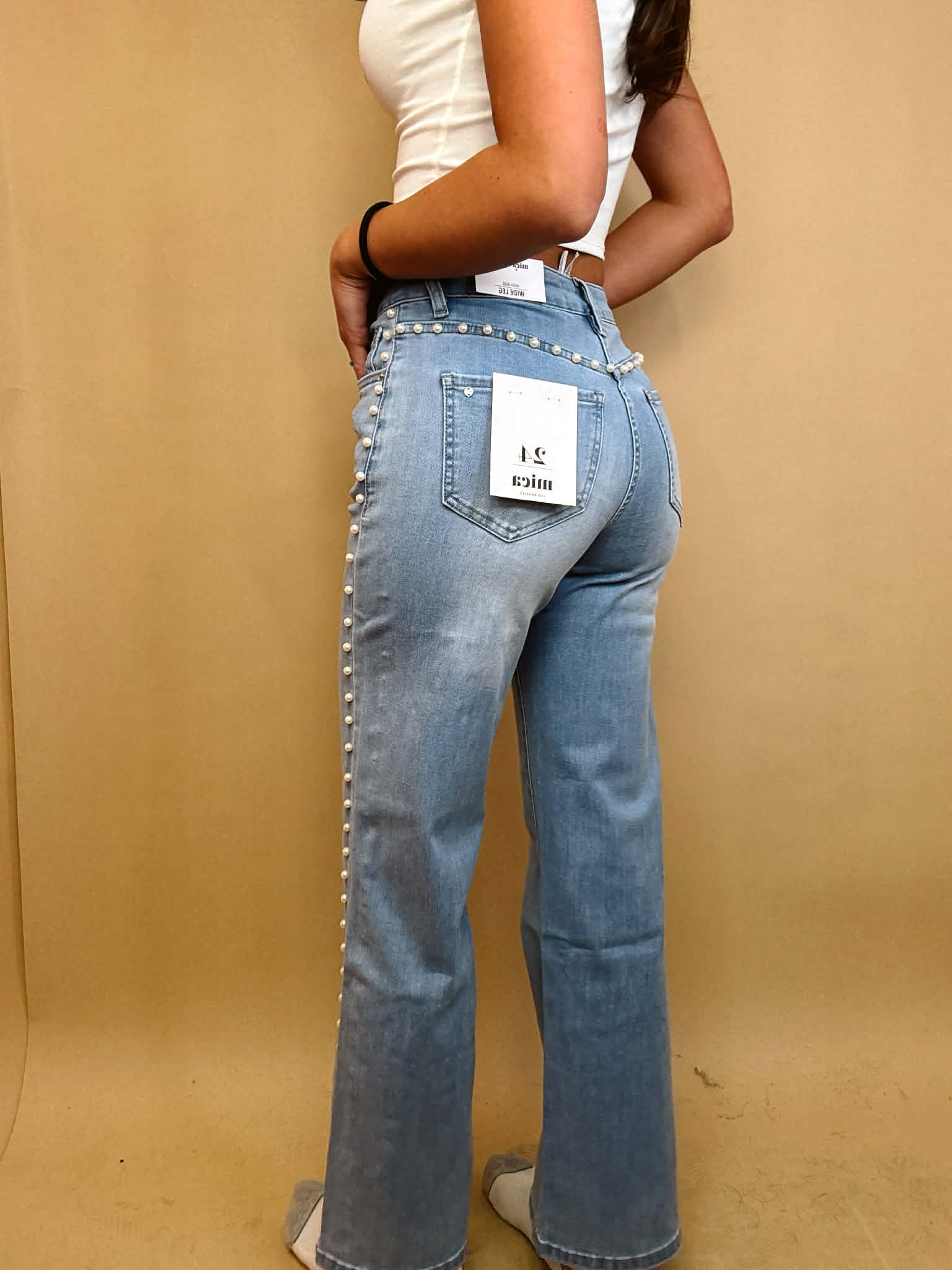 Step out in style with these high-rise wide leg jeans, featuring subtle pearl embellishments for a chic, elevated look. Comfortable yet fashionable, they’re perfect for dressing up or keeping it casual.