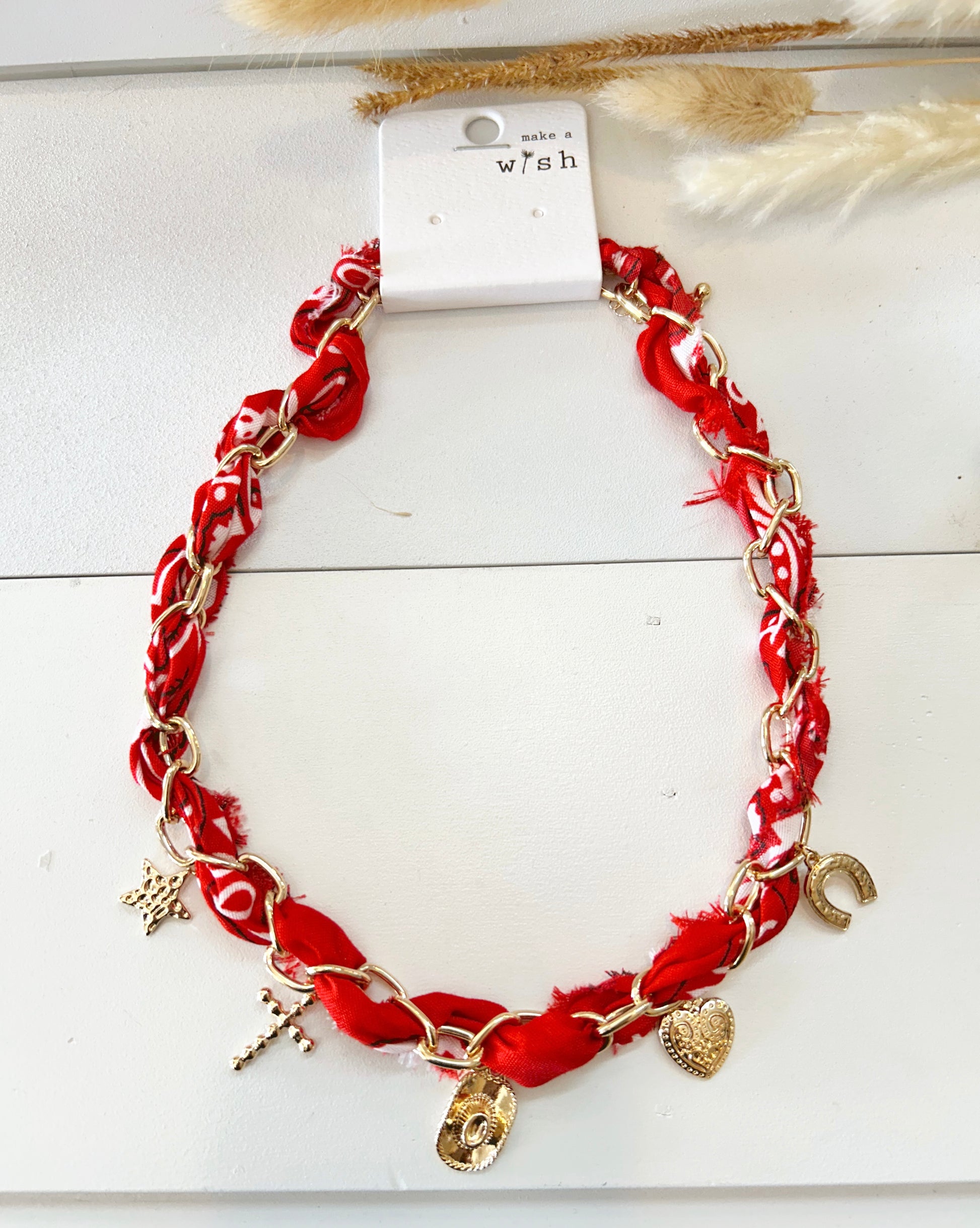 The Necklace brings effortless elegance with its design, featuring a red strand accented by gleaming gold charms. Chic and versatile, it’s the perfect statement piece for any occasion.