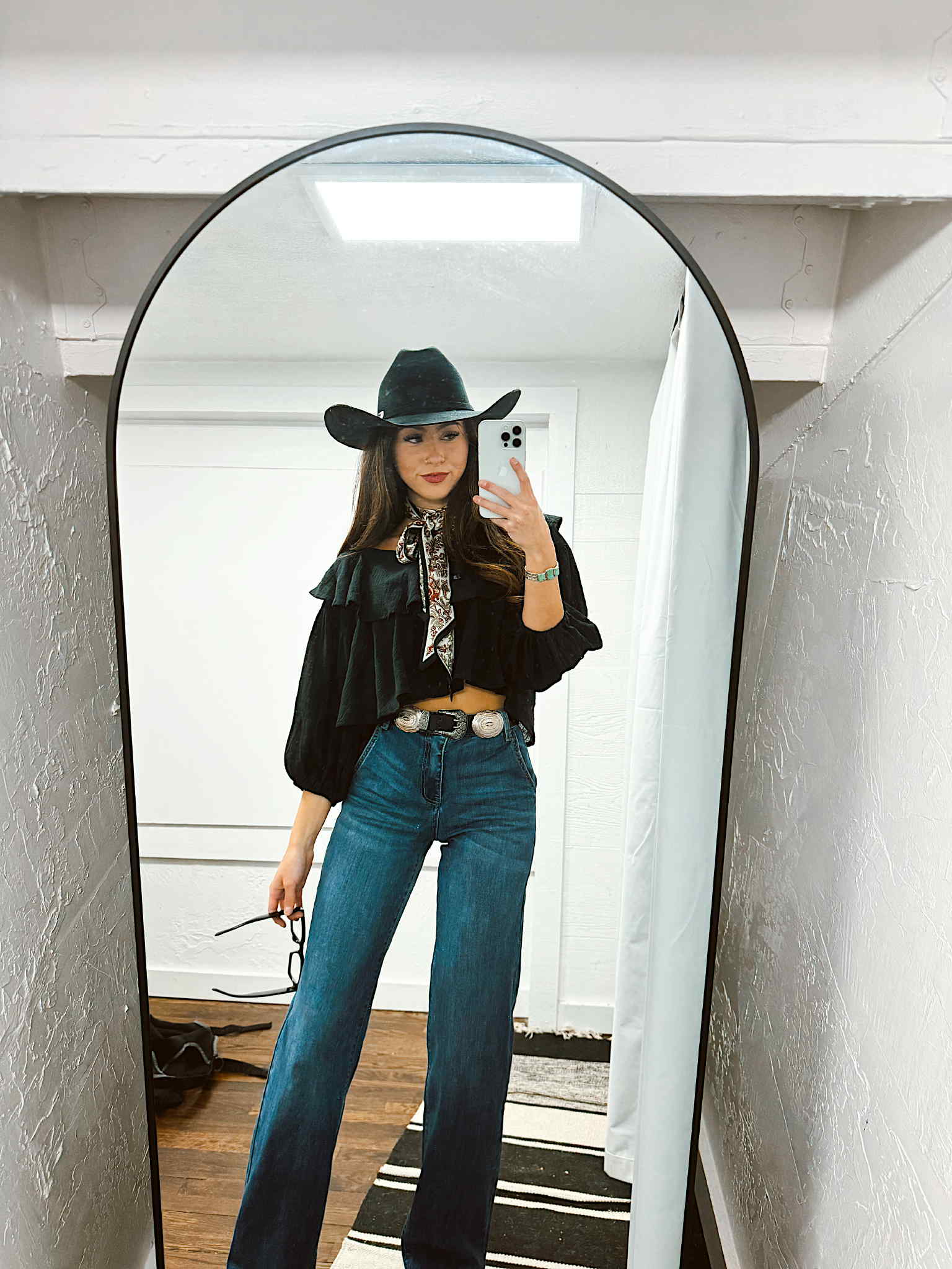 When basic just won’t cut it 🖤 This cropped black blouse brings all the flair with dramatic ruffle detail and voluminous sleeves. Light, airy, and effortlessly glam—she’s ready for anything from date night to girls’ night.