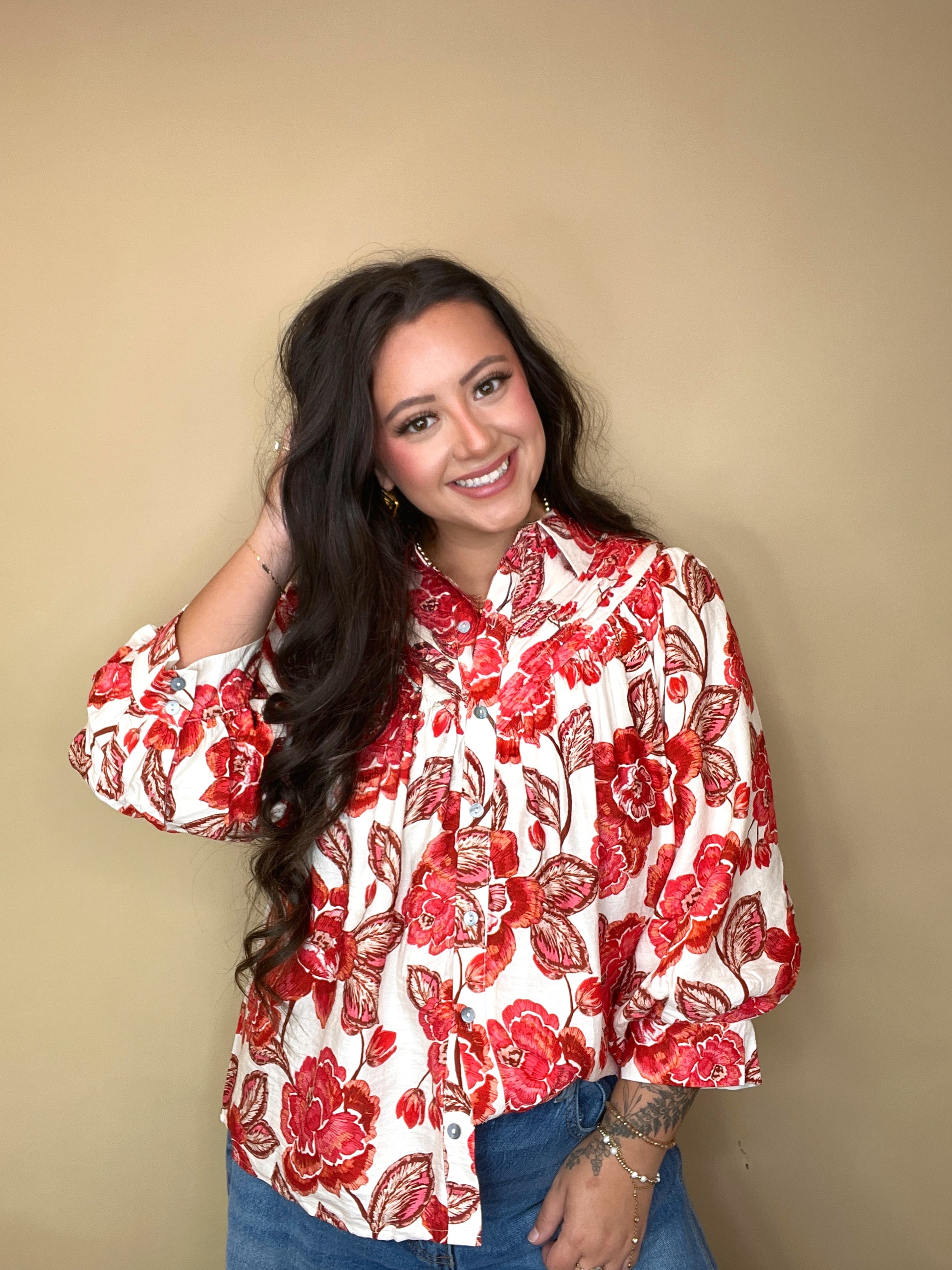 Meet the Rustic Rust Floral Collared Top – a romantic blend of vintage charm and feminine flair. With its delicate floral print and bubble cuff sleeves, this lightweight beauty is perfect for both casual days and dressed-up moments.