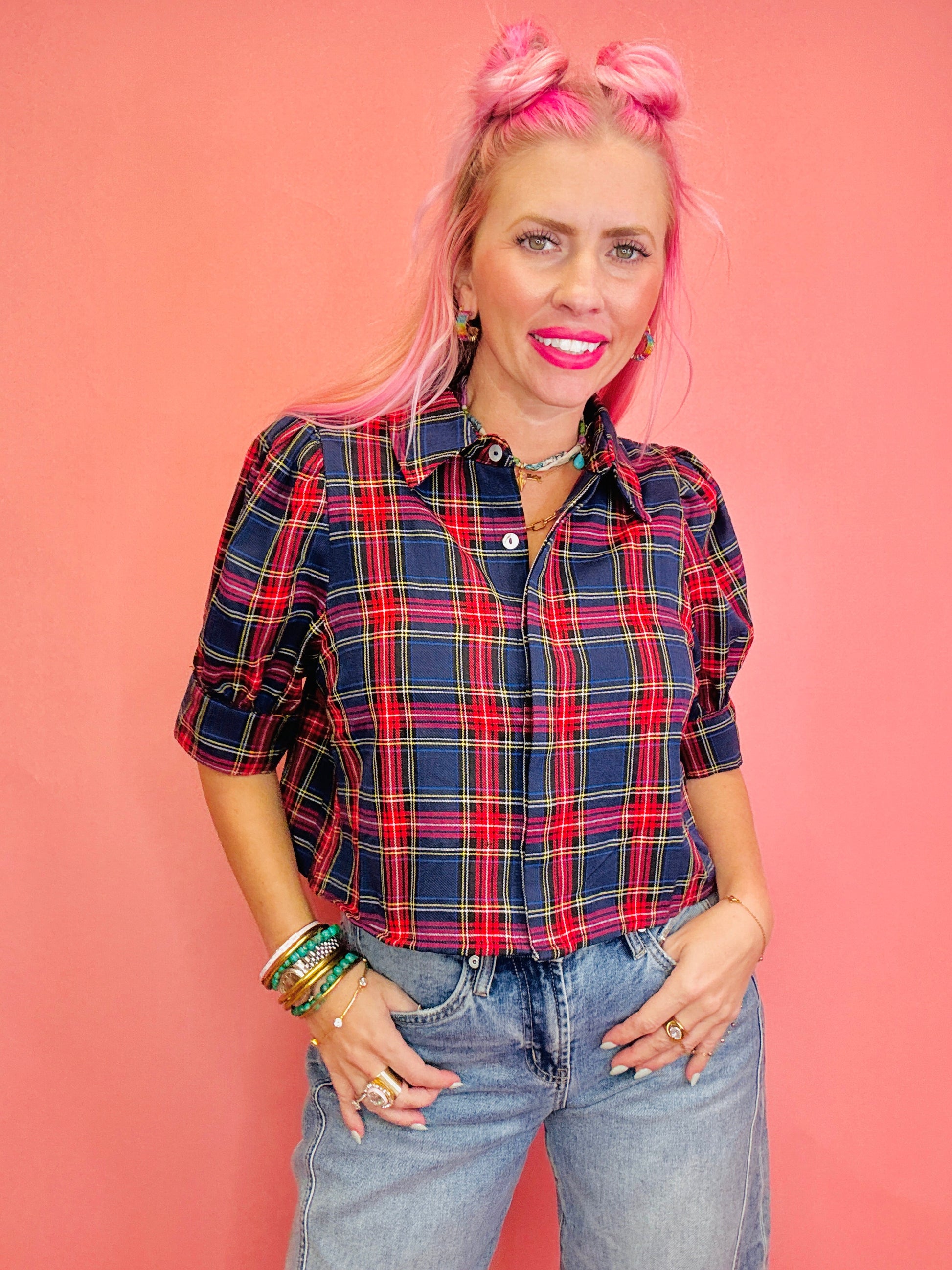Classic meets casual in this plaid waist-length top, complete with a crisp collar and button-front design. Lightweight and versatile, it’s the perfect piece to pair with denim or skirts for an effortless look.