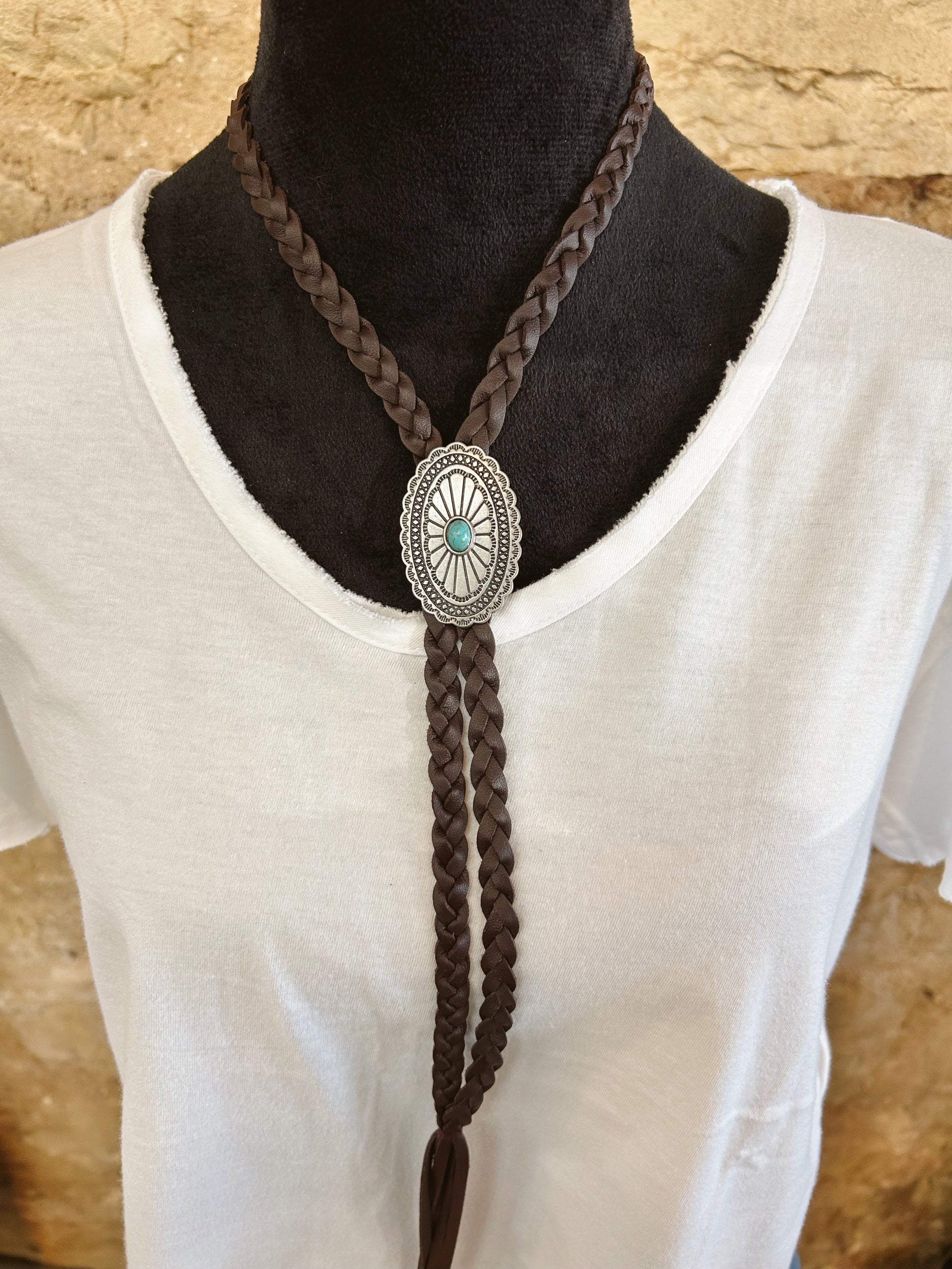 The Necklace bolo your combines rustic charm with effortless style. Featuring a turquoise concho centerpiece on a sleek leather band, it’s a striking statement piece for any western-inspired look.