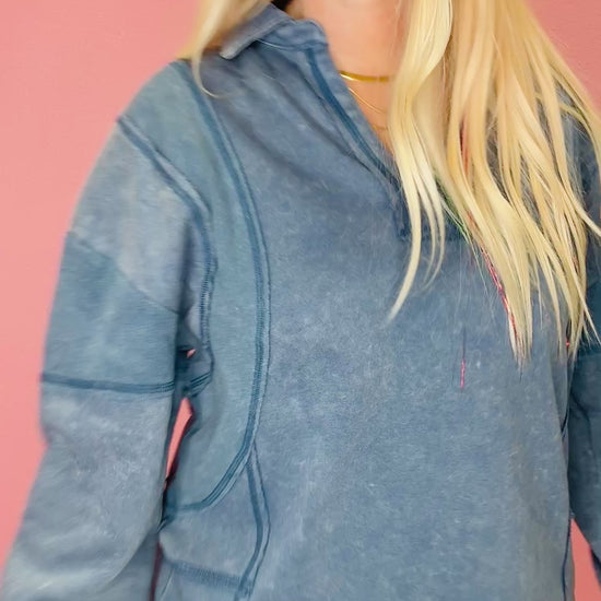 Blue oversized top. Ashley is shown wearing a small, sizing down from her true size and still plenty of room. Long enough to wear with leggings