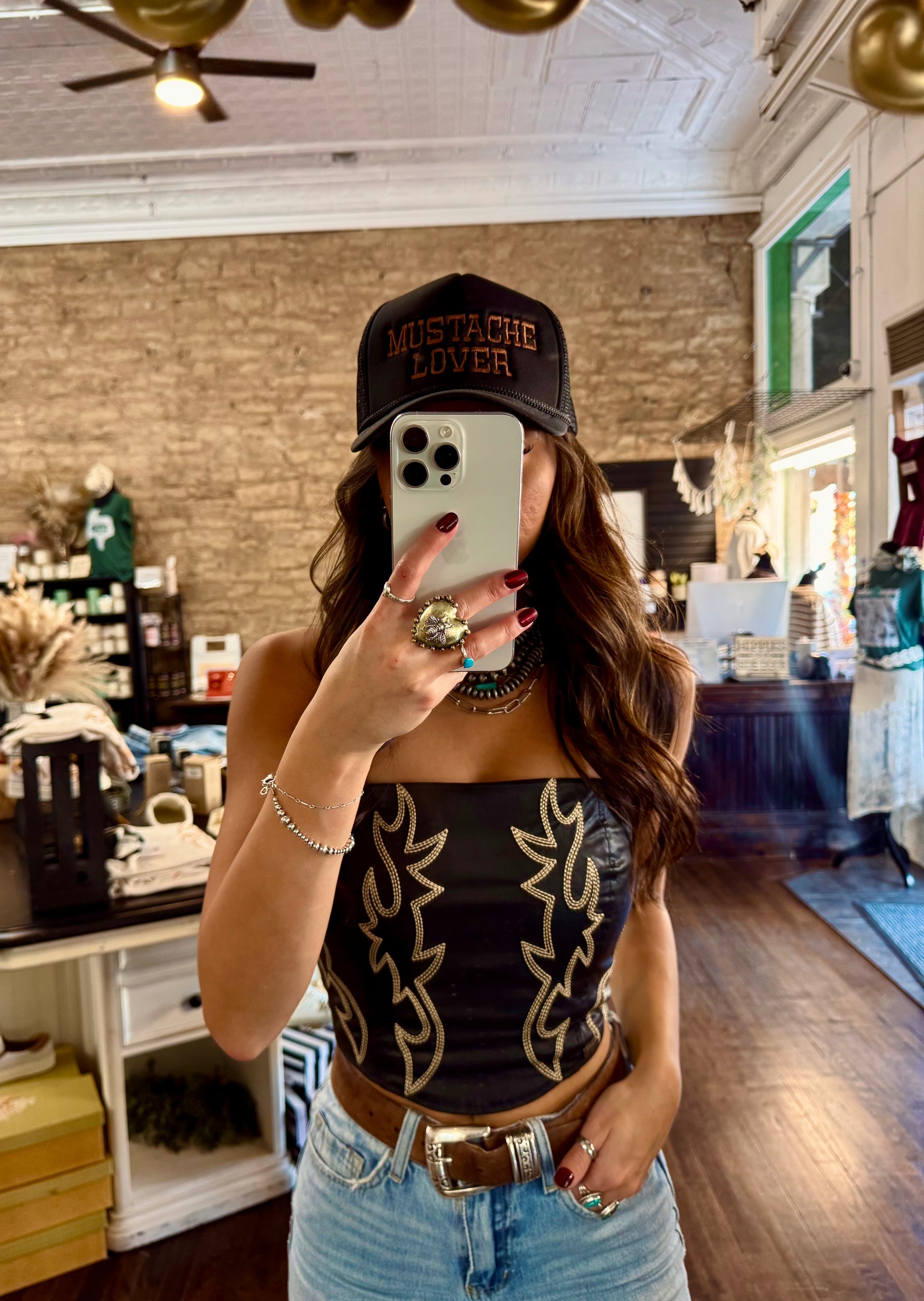 Capture authentic cowgirl style with this Black Strapless Leather-Look Corset Top, featuring stunning boot-stitch Western embroidery. Designed for the bold and confident, this structured piece combines rustic charm with a touch of rebellious femininity.