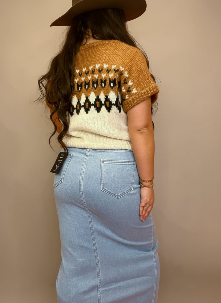 Step into timeless Western elegance with this Light Wash Denim Maxi Skirt, designed for cowgirls who love classic style with a modern twist. Featuring a high-rise fit and a center front slit, this skirt combines vintage rodeo charm with all-day comfort.