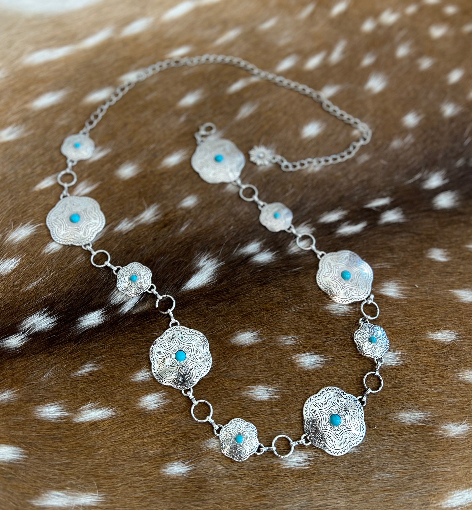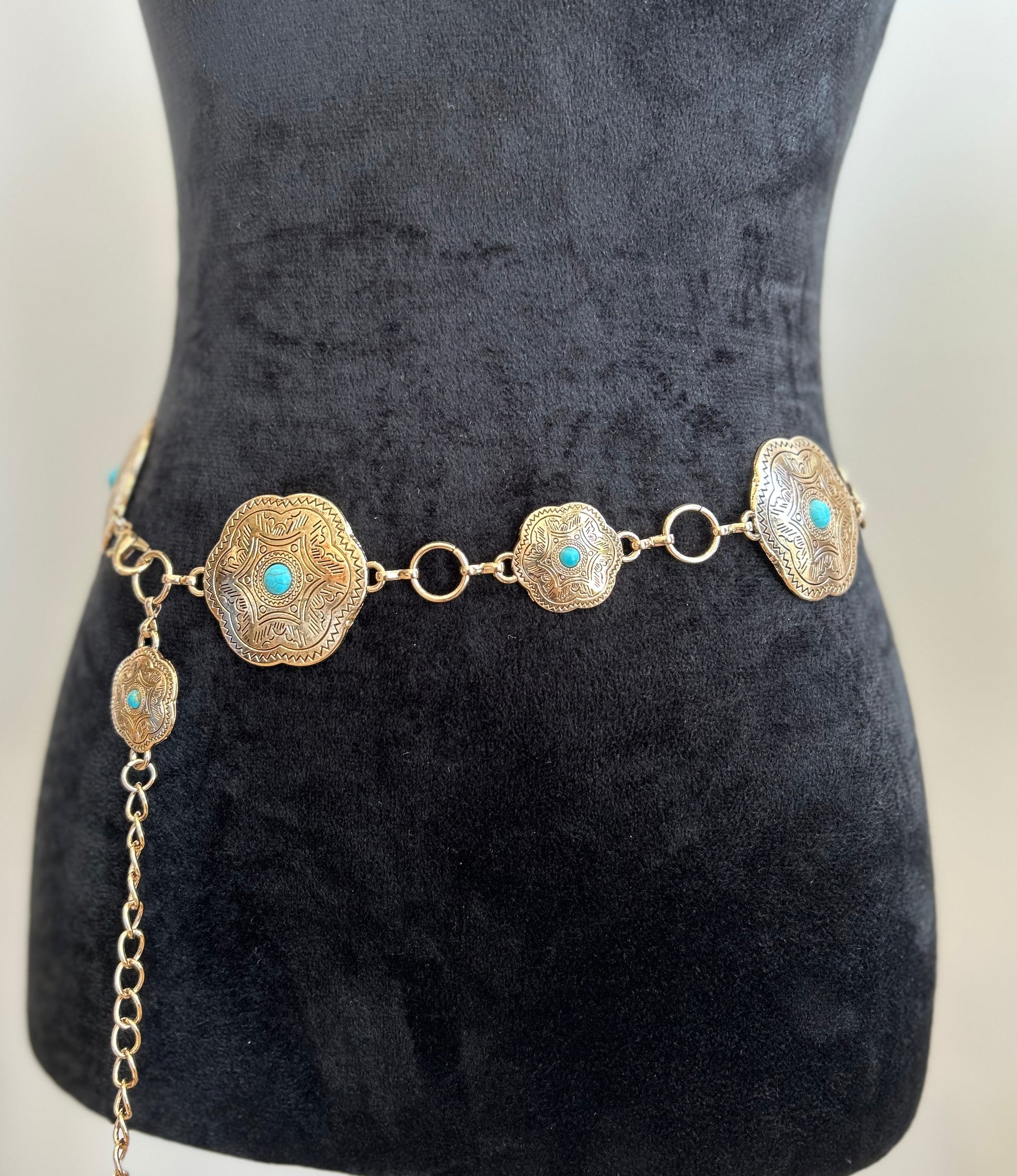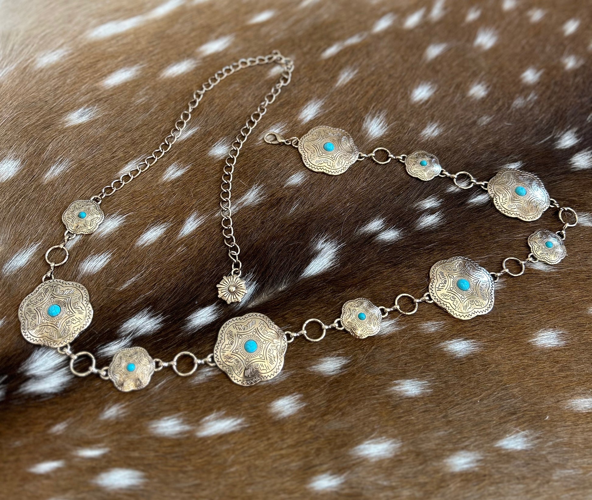 This is a must have chain belt that is designed with a floral disc western concho chain belt design.