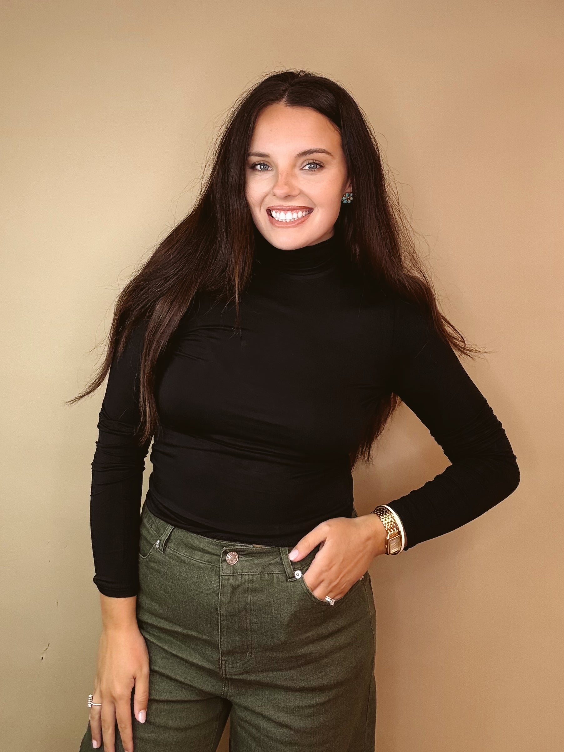 Ashlee is shown wearing the black in a size medium, her true size! Shown with our Pistachio Pants and the Quilted Charm Vest, also comes in cream!