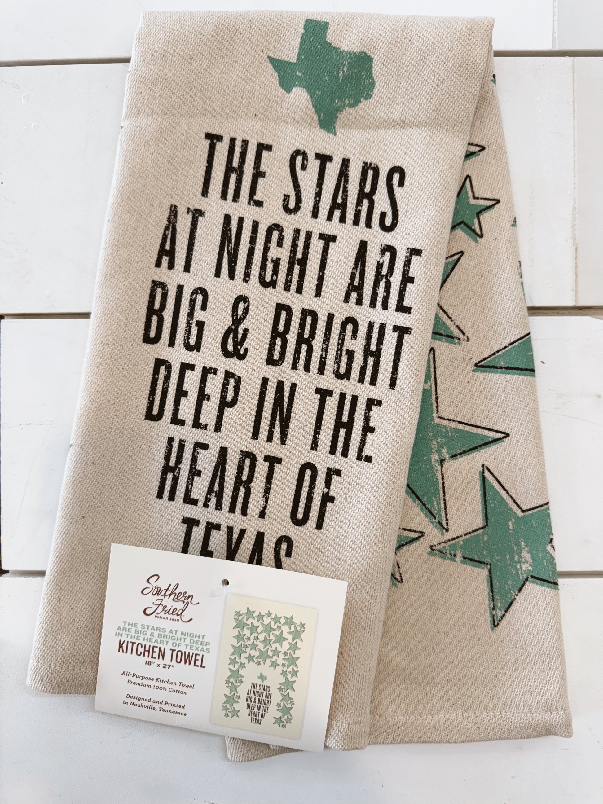 Celebrate Texas pride with this charming kitchen towel featuring the iconic phrase, "The Stars at Night are Big & Bright Deep in the Heart of Texas."