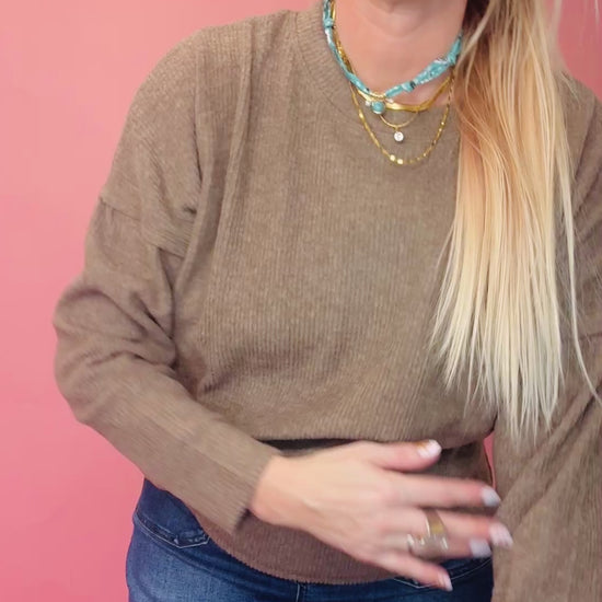 Loose and flowy fit. This ribbed brushed melange hacci sweater delivers ultra-soft comfort with a relaxed, casual look you'll reach for again and again. Finished with a front pocket and back patch detail, it's the perfect blend of cozy and cute.