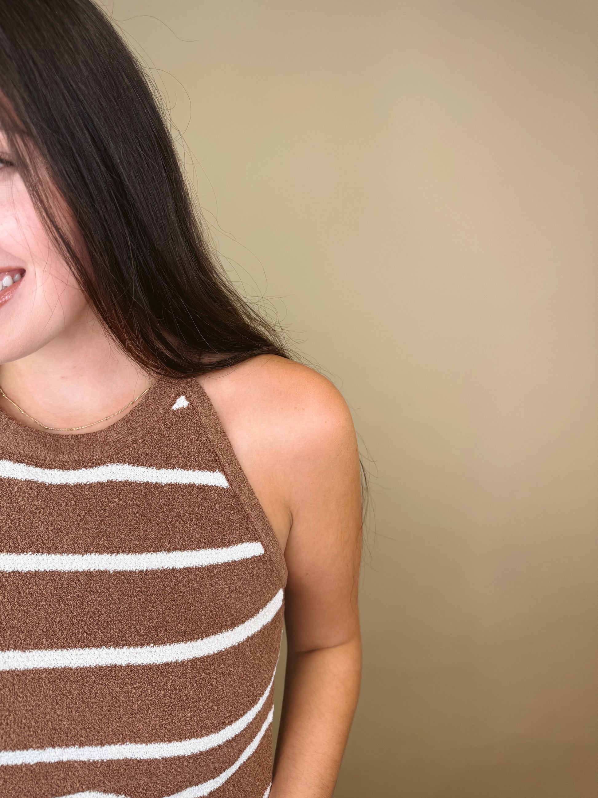 Bring effortless charm to your wardrobe with this stripe sweater tank top, perfect for layering or wearing on its own. Lightweight and versatile, it’s a chic staple for warm days or transitional seasons.