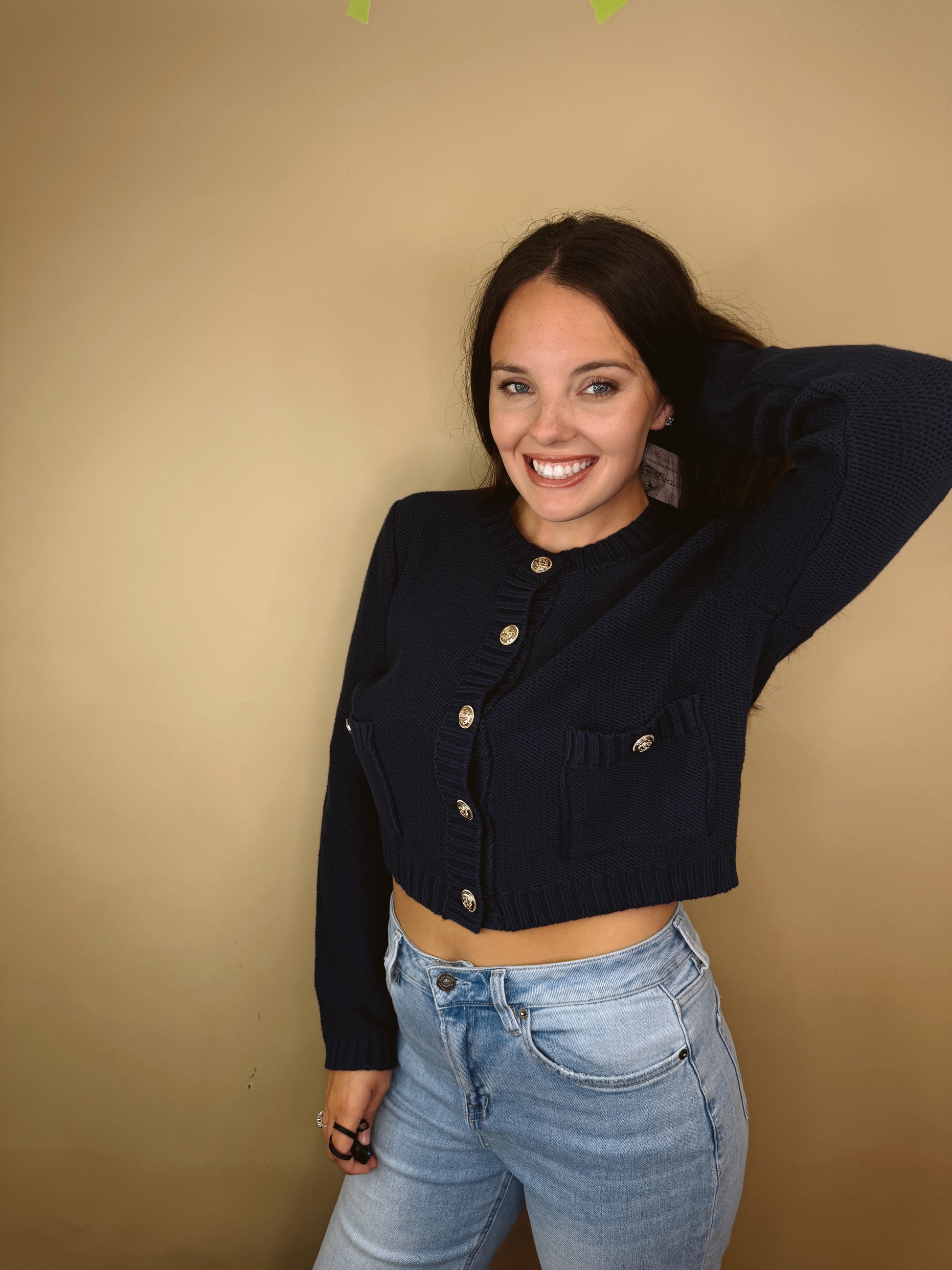 The Saylor Button-Up Cardigan is a chic, modern take on a classic knit, perfect for layering or wearing solo. Its cropped silhouette, ribbed trim, and gold-button hardware add a polished, contemporary touch to any outfit.