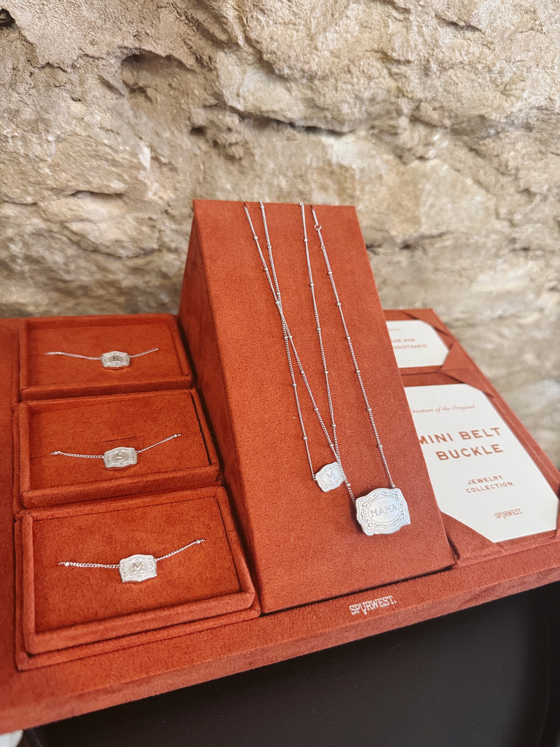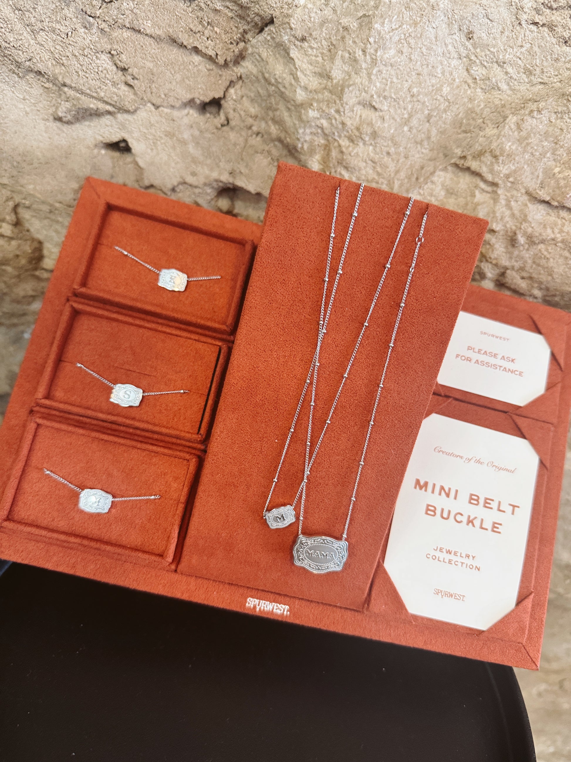 The Ultra Mini SpurWest belt buckle necklace. A jewelry piece you won't find anywhere else. Crafted with precision, our Rhodiumized necklaces ensure both style and durability. Tarnish-resistant and skin-friendly, these pieces stand tall as a new staple for western style.